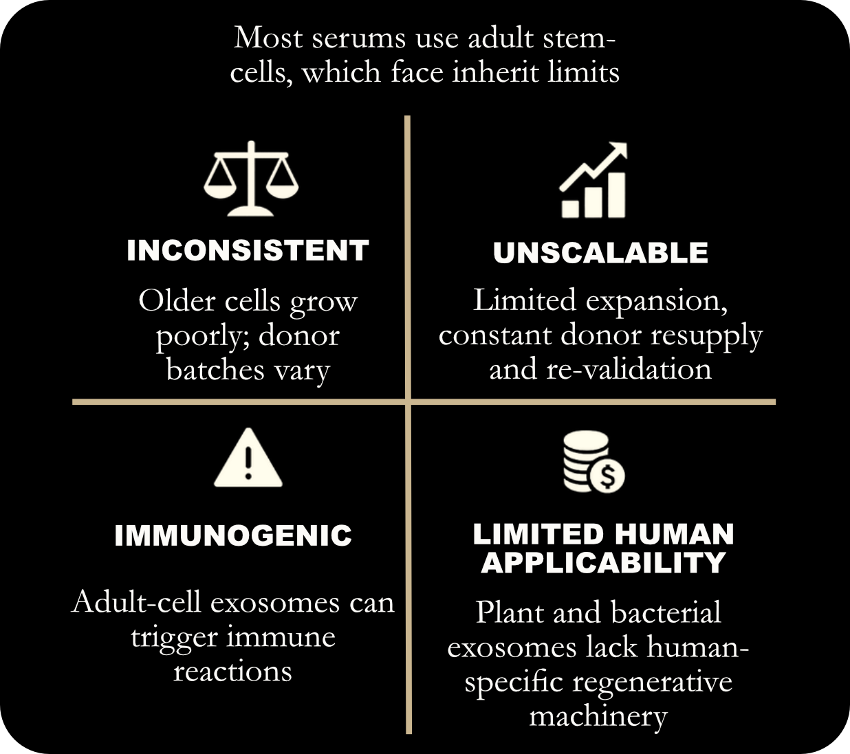 Adult stem cell–derived exosomes show potential but remain limited by variability, scalability, and lack of standardization.